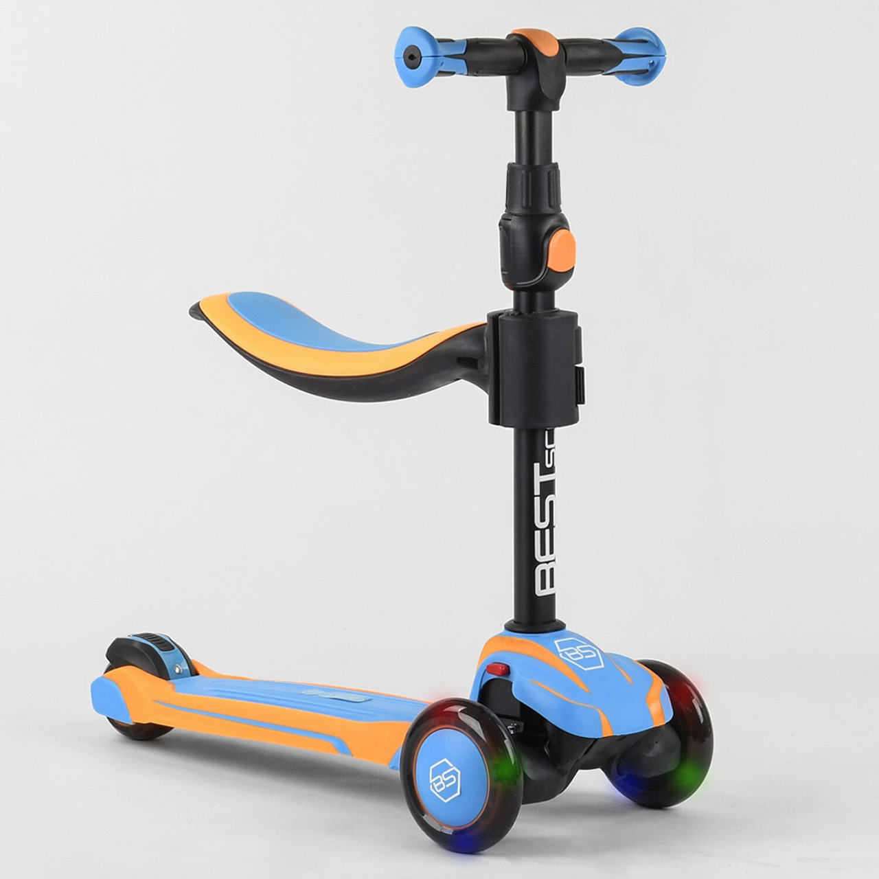 Триколісний самокат Best Scooter зі знімним сидінням, алюмінієвим кермом, і зі світловими PU колесами.